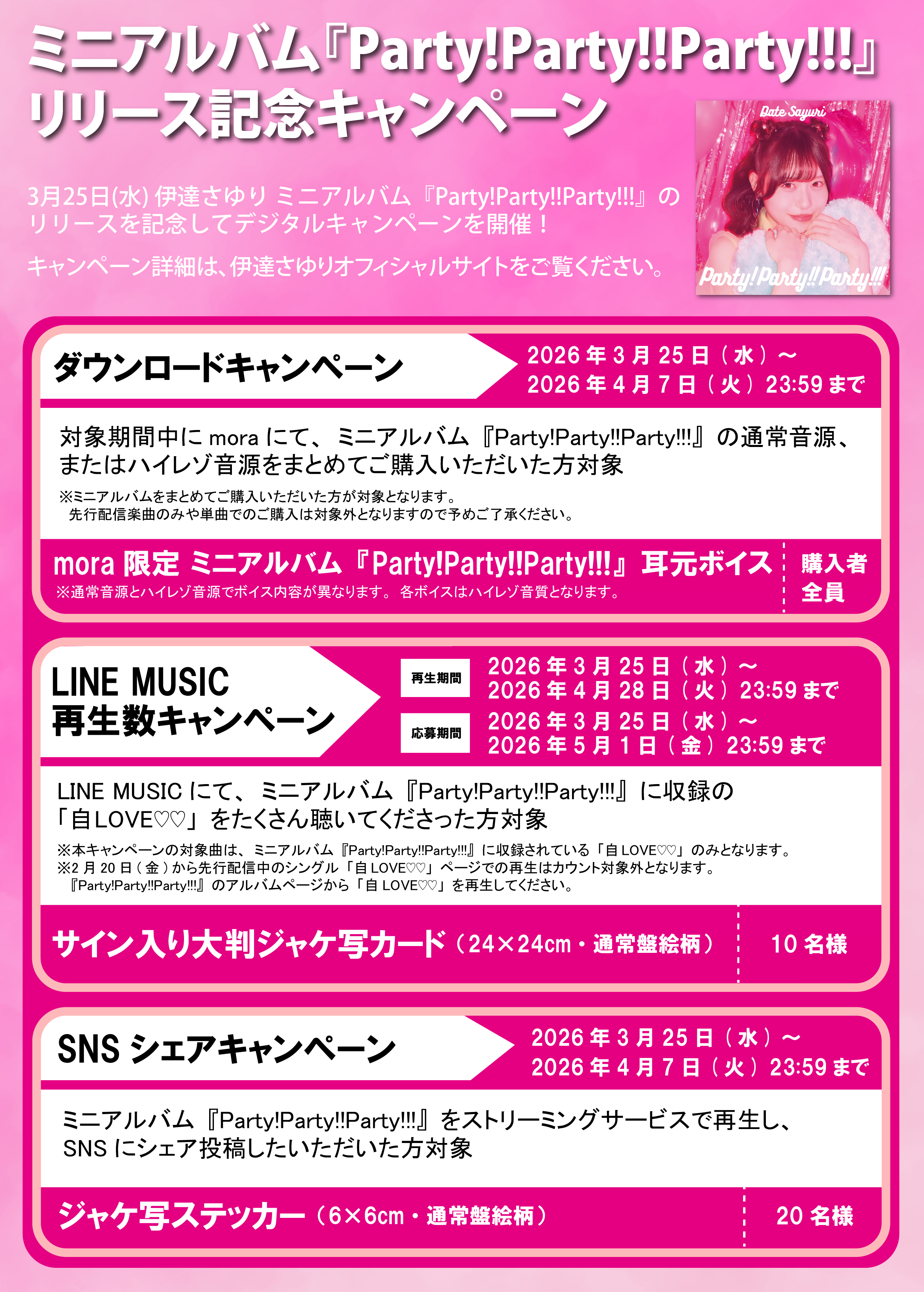 3月25日(水) ミニアルバム『Party!Party!!Party!!!』のリリースを記念して、デジタルキャンペーンがスタート!たくさんのご応募お待ちしております!