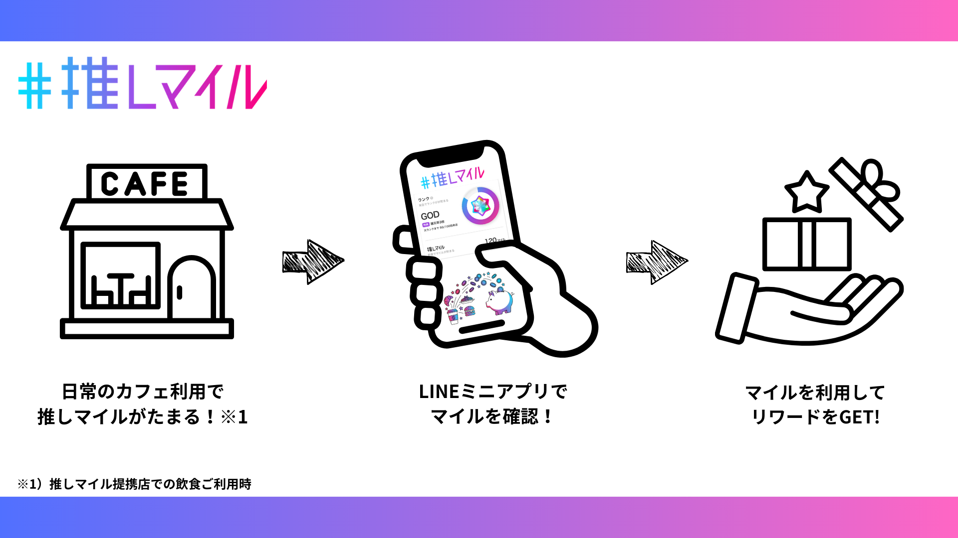 - マイルを貯める: 『推しマイル』LINEミニアプリでレシートを撮影し、飲食金額に応じたマイルを獲得